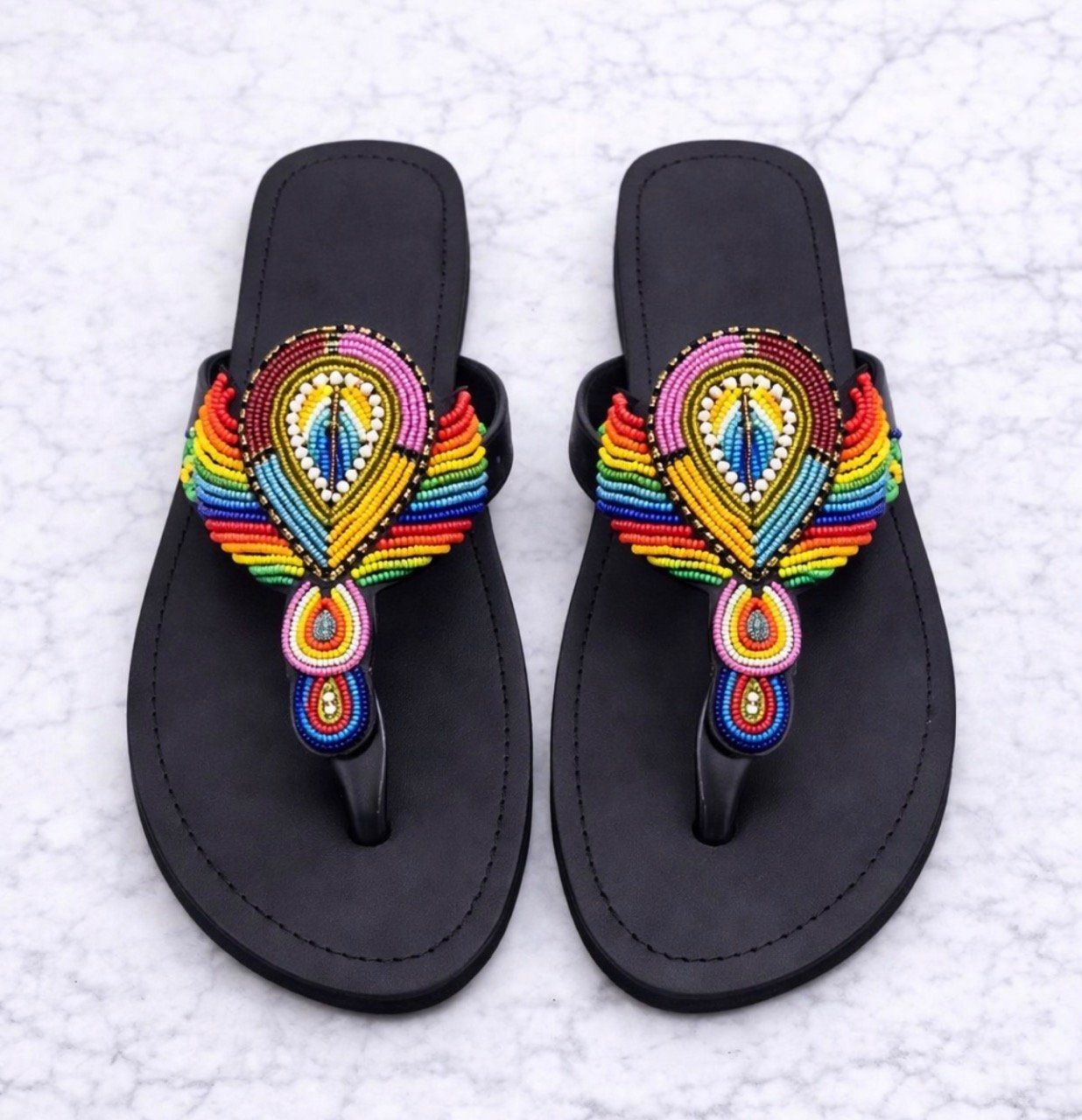 Soigneusement fabriqué avec des perles de rocaille tchèques, du cuir et une semelle en caoutchouc.