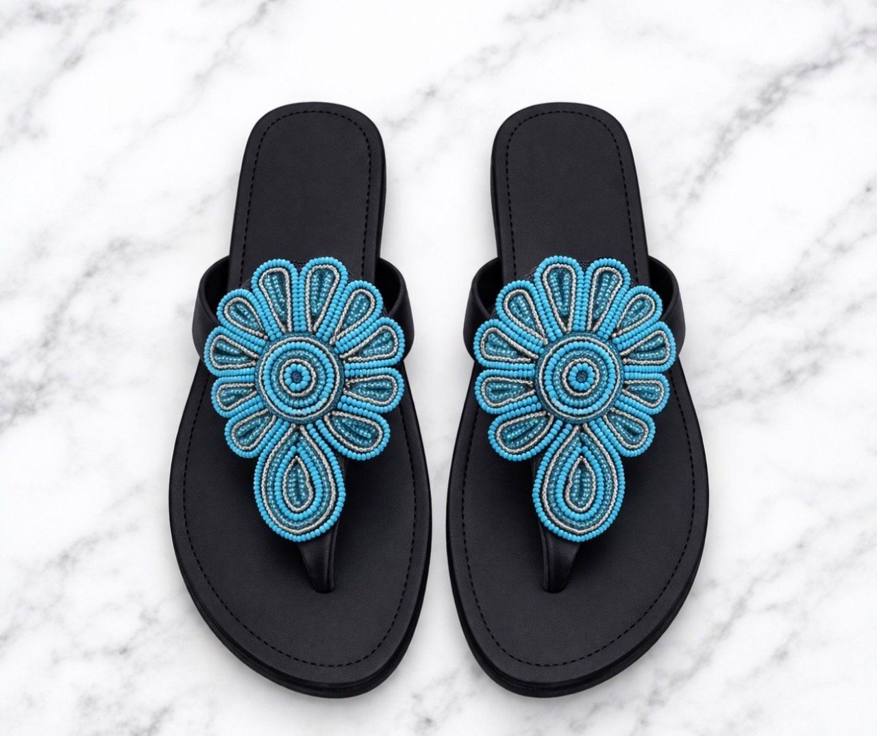 Soigneusement fabriqué avec des perles de rocaille tchèques, du cuir et une semelle en caoutchouc.