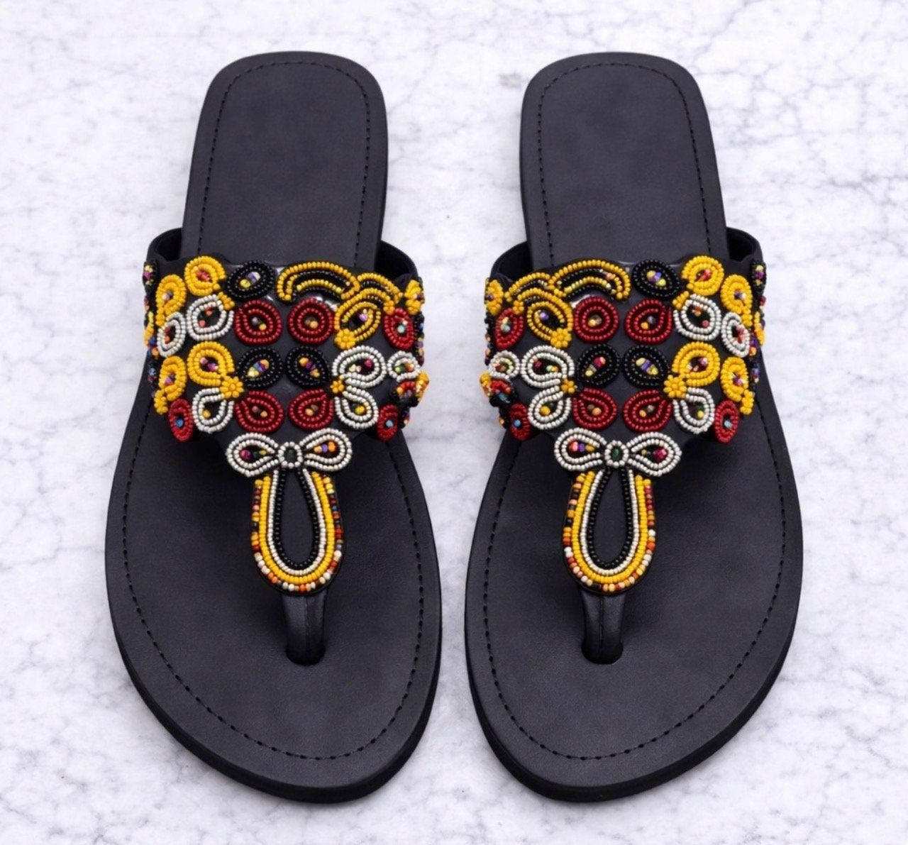 Soigneusement fabriqué avec des perles de rocaille tchèques, du cuir et une semelle en caoutchouc.