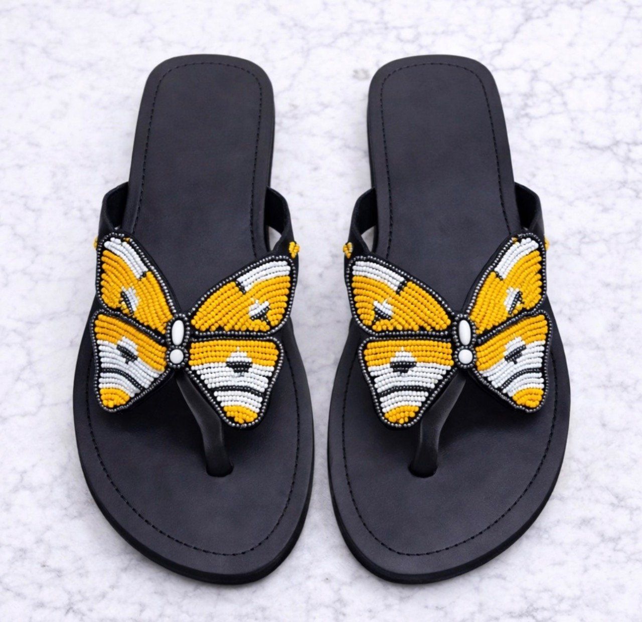 Soigneusement fabriqué avec des perles de rocaille tchèques, du cuir et une semelle en caoutchouc.