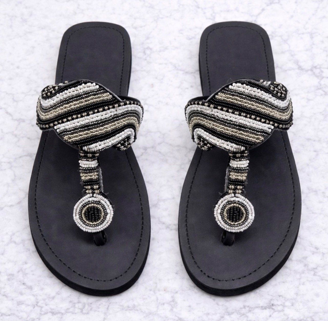 Soigneusement fabriqué avec des perles de rocaille tchèques, du cuir et une semelle en caoutchouc.