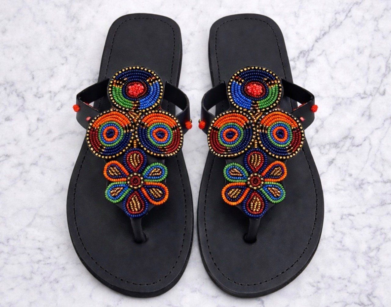 Soigneusement fabriqué avec des perles de rocaille tchèques, du cuir et une semelle en caoutchouc.